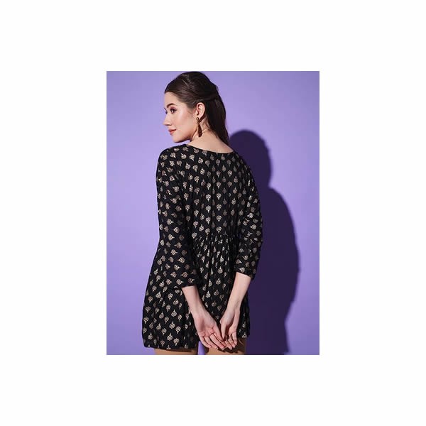 It's a new style gold block print short kurti top made with Comfortable cotton fabric, round neck, 3/4th sleeves, flares on waist area, good gota work with small knot on neck makes it look more beautiful. This can be used for festivals, parties and weddings and ideals for women and girls. Size Chart In Inches - Size : M "Bust 38 Length 29" Size : L "Bust 40 Length 29" Size : XL "Bust 42 Length 29" Size : XXL "Bust 44 Length 29"