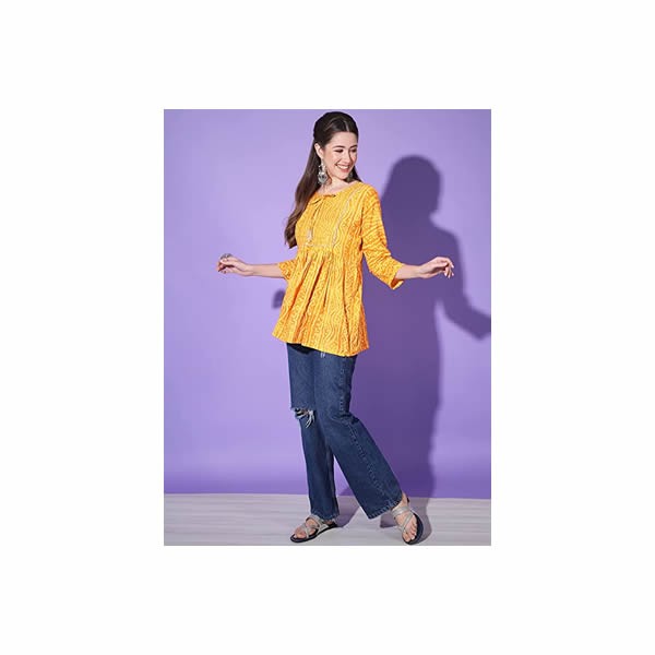 new short flared short kurta top, flares on waist area, 3/4th sleeves, round neck, small knot on neck area, made with soft and comfortable cotton fabric , goes best with jeans for your normal days. Size Chart In Inches - Size : M "Bust 38 Length 29" Size : L "Bust 40 Length 29" Size : XL "Bust 42 Length 29" Size : XXL "Bust 44 Length 29"