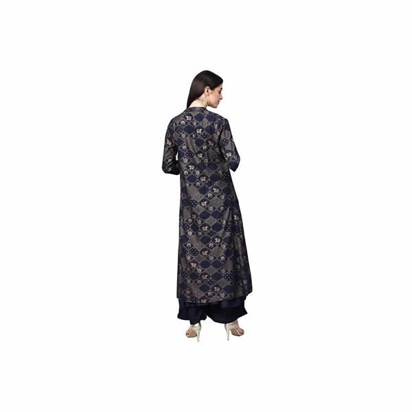 Navy Blue embroidered anarkali kurta palazzo set with jacket, has a round neck, three-quarter sleeves, flared hem, has no slits.