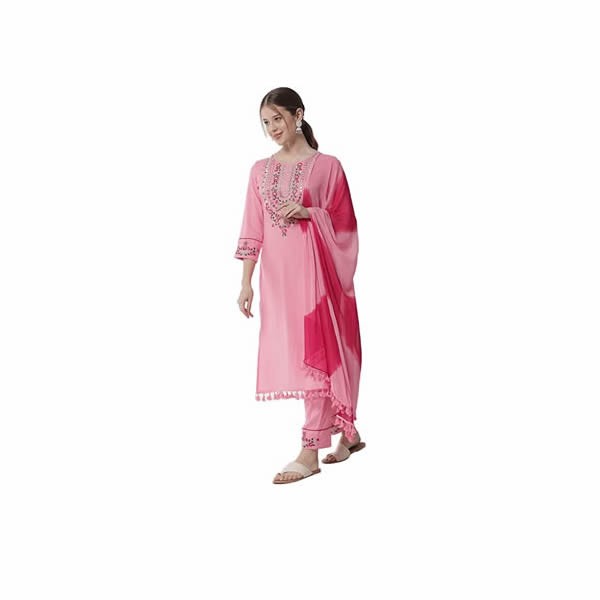 This stunning women's kurta set is made from soft and lightweight rayon fabric and features a beautiful floral print. The empire waist style flatters the figure and the straight silhouette falls elegantly over the body, making it suitable for both casual and formal occasions. The set includes matching trousers and a dupatta, completing the look and adding a touch of elegance. The kurta has short sleeves and a round neckline, while the trousers have a relaxed fit and are full length. The dupatta can be worn over the head or draped over the shoulders for added coverage. This three-piece set is easy to care for and maintain, making it a practical choice for everyday wear. It is available in multiple sizes to fit a range of body types and is a stylish and versatile addition to any woman's wardrobe.
