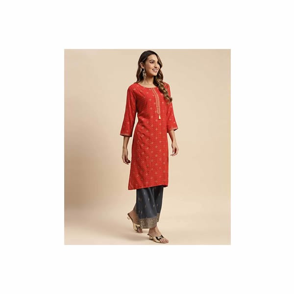 Women Rayon All Over Gold Ethnic Print Calf Length Straight Kurti -Red