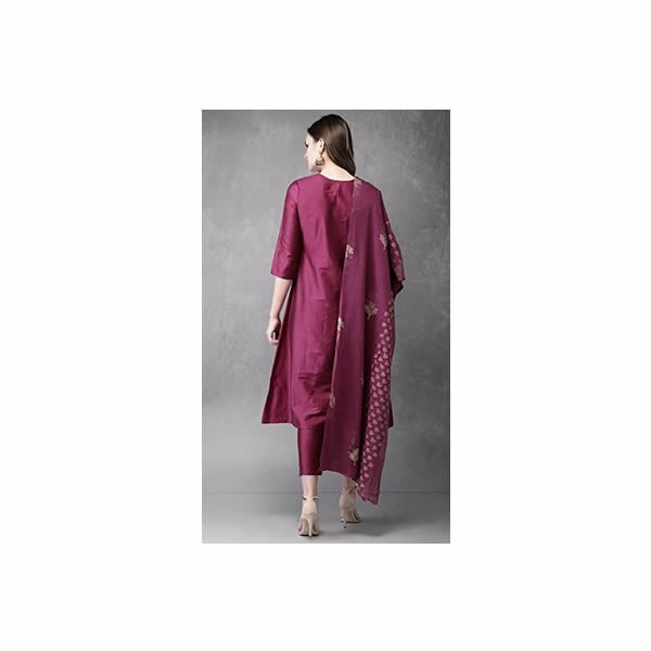 Women's Cotton Regular Kurta with Pant & Dupatta (Wine)-P