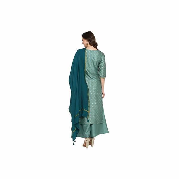 Premium Collection by Janasya. Look elegant and stylish at your next big event in this Light green kurta set from Janasya. Light Green foil print kurta from this set features round neck with foil print overall, 3/4th sleeve, Princess cut highlighted by gota patti and is of calf length lined with crepe lining to give maximum comfort. Light Green solid palazzo comes with fully elasticated waistband and is 38" in height. To complement this lovely kurta set there is an muslin duppata of green color with tassel detailing on hemlines. Complement the intricate detailing of this kurta set with gold accessories.