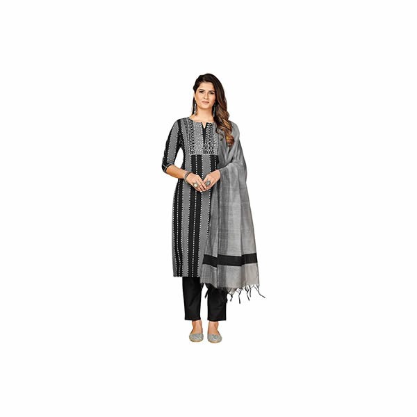 Women's Printed & Embroidered Straight Cotton Blend Black Stitched Kurta Pant with Dupatta