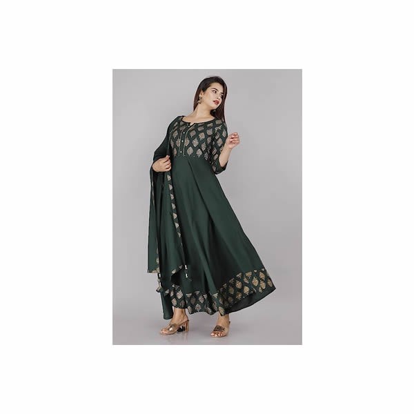 Women's Rayon Gold Print Flared Kurta with Dupatta0